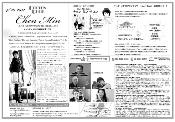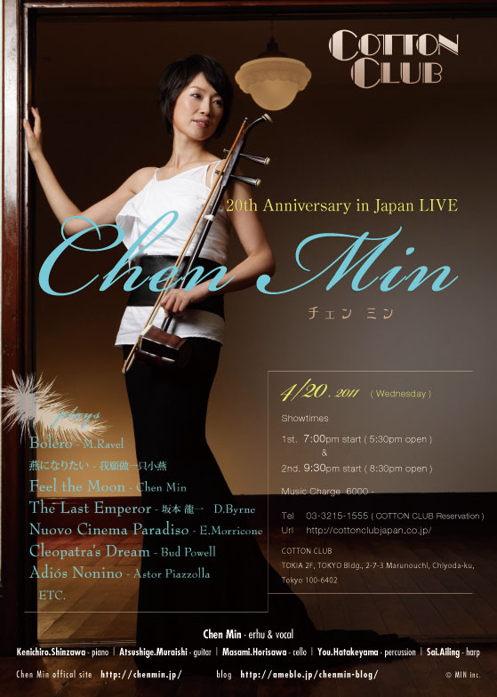 【出演者】 チェン ミン:二胡、ボーカル 新澤 健一郎:ピアノ 村石 篤重:ギター 堀沢 真己:チェロ はたけやま裕:パーカッション 彩 愛玲:ハープ |