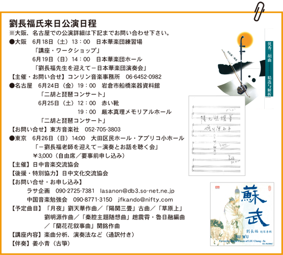 創刊記念キャンペーンの一環として、本誌定期購読者の方には、6月26日(日)「−劉長福老師を迎えて−演奏とお話を聴く会」の入場料\3,000を\2,500に特別優待致します。お申し込みは「二胡之友」電話03(6457)4637まで。締め切りは6月10日。多くの皆様のお申し込みをお待ちしております。