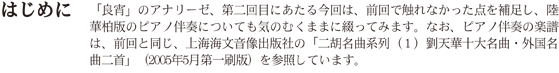 今、劉天華の独自な感覚と言いましたが、例えば、民間音楽では、ゆっくり始まって、段階を追って速度を増し、最後は最高潮を迎えて終わる、といった明快な構成がよく見られます。「良宵」を始め、劉天華の作品は、このような慣習的な構成法を安易に用いないで、一つ一つ、独自の感覚で工夫を凝らした形跡が見られます。そして、これこそ劉天華の創作者としての矜持が感じられる点の一つではないでしょうか。
