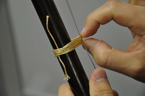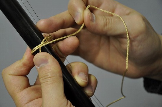 前回も触れましたが、千斤の装着位置には諸説あります。胴体に肘を載せ、腕を棹に平行に添わせて、小指のつけ根辺りに千斤を装着する方法。また、棹の長さや蛇皮の状態に合わせて、最も良い音色が出る位置を特定し千斤を装着する方法など、適切な千斤の位置を決める方法は、製作者や演奏者によって異なります。