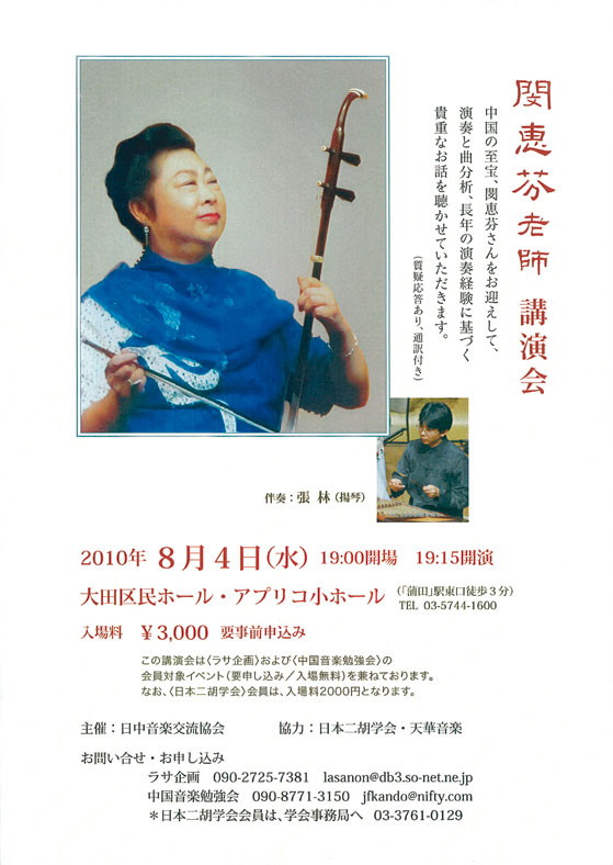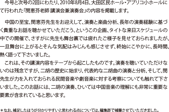 今日の講演の演目は、胡琴についてのお話です。胡琴というのは二胡と同じような構造を持った楽器の総称ですが、その簡単な歴史と、そして優れた作曲家の曲の中から選んで、現代までのいろいろな素晴らしい作品を紹介したいと思います。