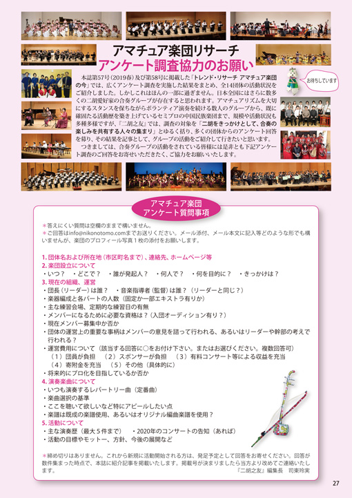 アマチュア楽団リサーチ アンケート調査協力のお願い 本誌第57号(2019春)及び第58号に掲載した「トレンド・リサーチ アマチュア楽団の今」では、広くアンケート調査を実施した結果をまとめ、全14団体の活動状況をご紹介しました。しかしこれはほんの一部に過ぎません。日本全国にはさらに数多くの二胡愛好家の合奏グループが存在すると思われます。アマチュアリズムを大切にするスタンスを保ちながらボランティア演奏を続ける数人のグループから、既に確固たる活動歴を築き上げているセミプロの中国民族楽団まで、規模や活動状況も多種多様ですが、『二胡之友』では、調査の対象を「二胡をきっかけとして、合奏の楽しみを共有する人々の集まり」とゆるく括り、多くの団体からのアンケート回答を募り、その結果を記事として、グループの活動をご紹介して行きたいと思います。 |