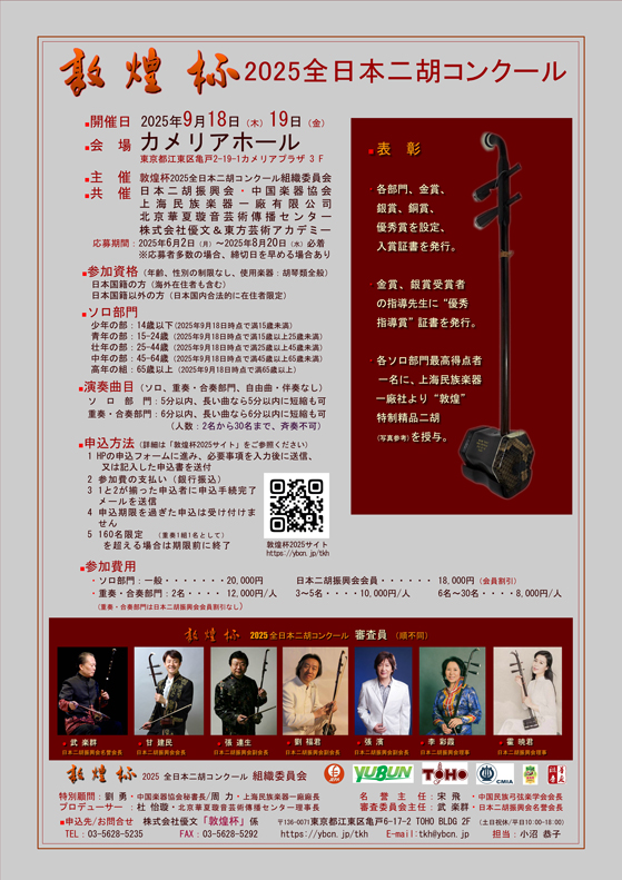 2019年には日本、シンガポール、北アメリカ、オーストラリアで、中国国外で初めてとなる“敦煌杯”が開催され、特に日本では周知度と影響力が大きく、プロ、アマの二胡関係者の多くが積極的に参与して行われた。