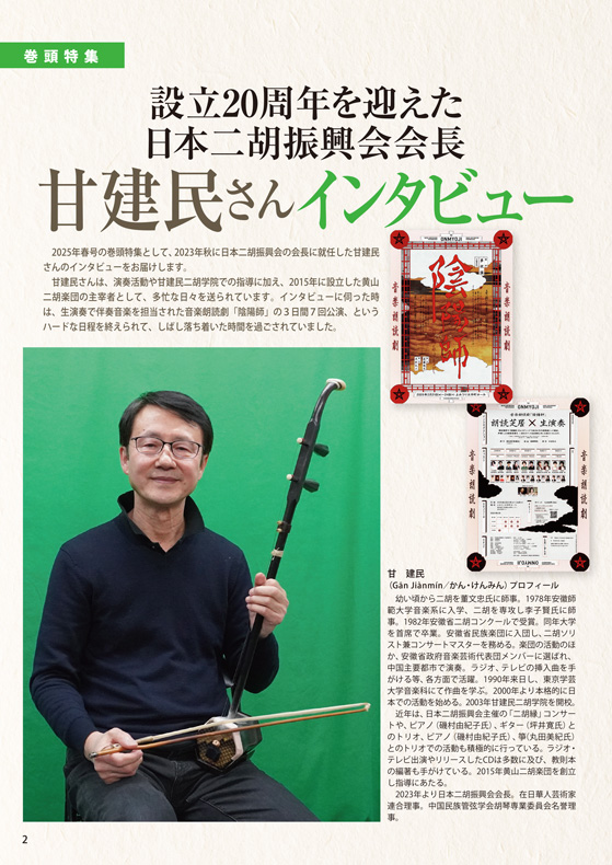 2025年春号の巻頭特集として、2023年秋に日本二胡振興会の会長に就任した甘建民さんのインタビューをお届けします。 甘建民さんは、演奏活動や甘建民二胡学院での指導に加え、2015年に設立した黄山二胡楽団の主宰者として、多忙な日々を送られています。インタビューに伺った時は、生演奏で伴奏音楽を担当された音楽朗読劇「陰陽師」の3日間7回公演、というハードな日程を終えられて、しばし落ち着いた時間を過ごされていました。 (詳細は本誌をご覧ください)
