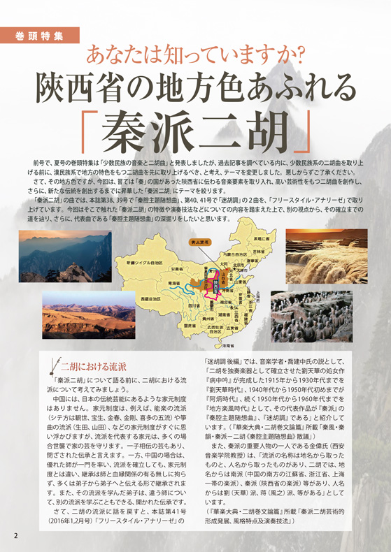 「秦派二胡」の曲では、本誌第38、39号で「秦腔主題随想曲」、第40、41号で「迷胡調」の2曲を、「フリースタイル・アナリーゼ」で取り上げています。今回はそこで触れた「秦派二胡」の特徴や演奏技法などについての内容を踏まえた上で、別の視点から、その確立までの道を辿り、さらに、代表曲である「秦腔主題随想曲」の深掘りをしたいと思います。